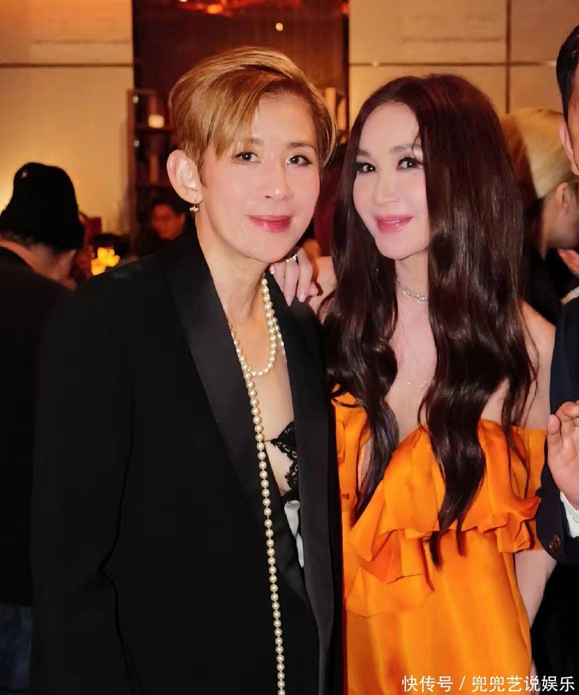 温碧霞与吴君如的同框,则呈现出截然不同的风格碰撞。吴君如依旧保持利落飒爽的个人特色,一头利落的金色短发搭配精致妆容,气场全开。黑色西装造型干练大气,颈间点缀一条珍珠长项链,刚柔并济,尽显独立干练的女性风范,“大姐大”气质拉满。两位风格迥异的女神同框,一柔一飒,视觉效果十分惊艳。