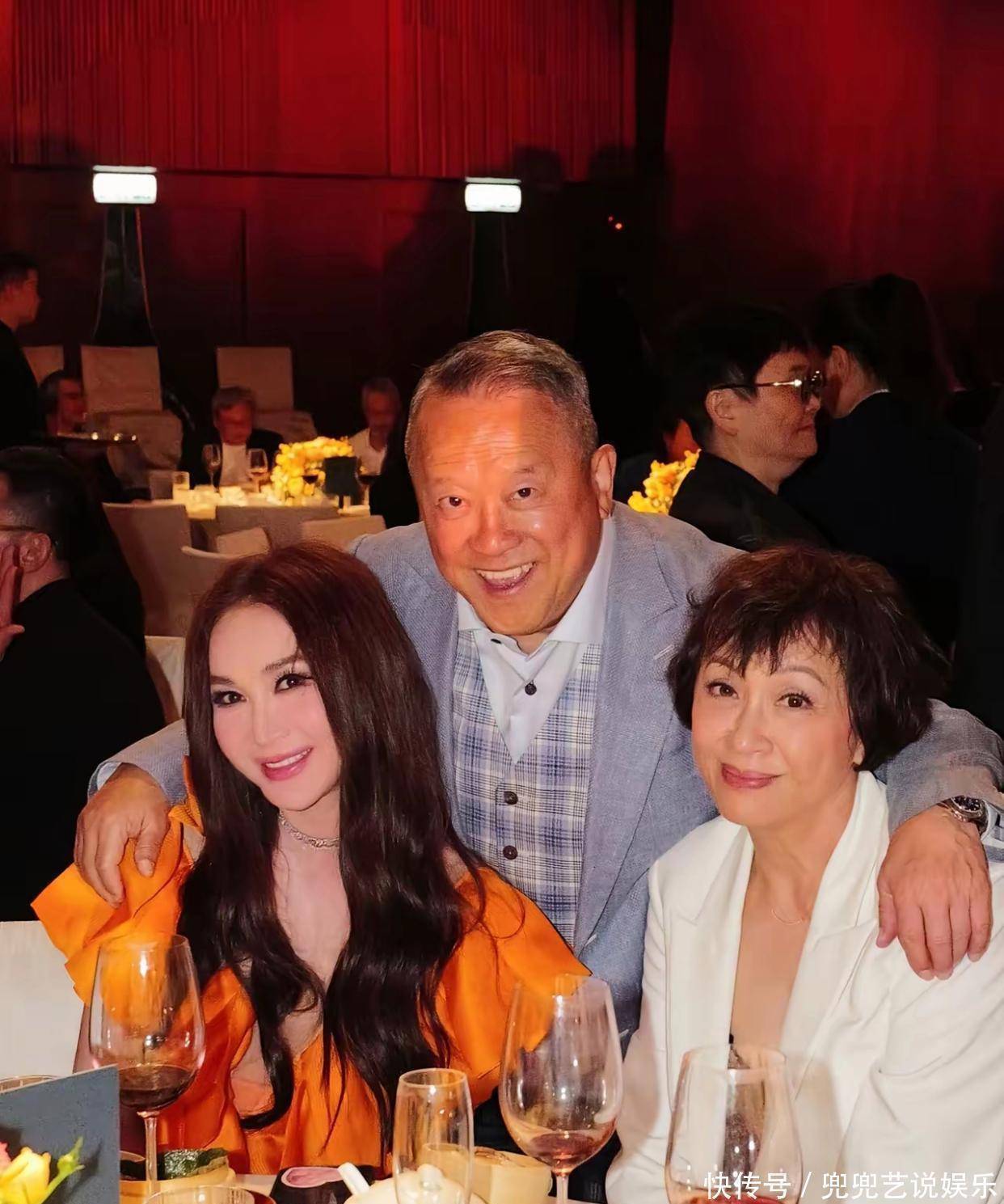 随后,温碧霞与曾志伟的合影同样看点十足。照片中,温碧霞端坐桌旁,身旁另有一位白衣友人相伴,曾志伟则站在两人身后,手臂自然搭在二人肩头,三人同框笑容灿烂、氛围融洽。曾志伟当天身着浅蓝色西装外套,内搭格纹马甲与白色衬衫,穿搭精致得体,精神状态极佳,镜头下的模样比荧幕中更显年轻精神,气场亲和又不失气场。
