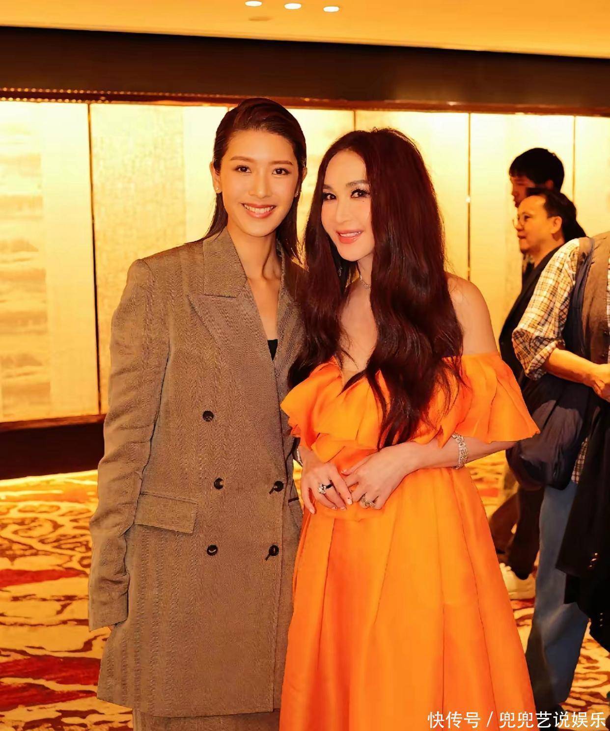 与青年演员陈家乐合影时,温碧霞的状态更显年轻娇美。近距离镜头下,她面部饱满紧致,妆容清透干净、气色明亮,依旧是记忆中的优雅模样。身旁的陈家乐发型帅气,身着米咖色西装套装,内搭黑色打底衫,俊朗有型,相较于舞台形象更添几分沉稳帅气。