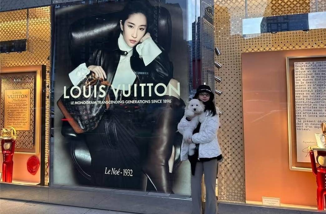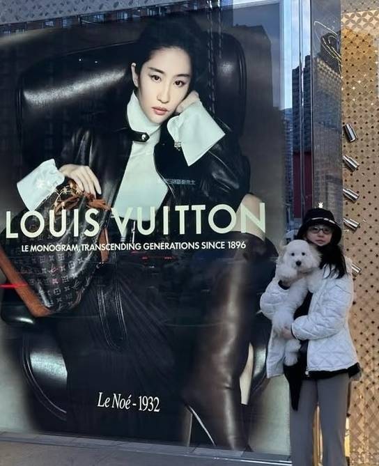 到了外面,刘亦菲就穿了一件白色的羽绒服外套,站在LV的店门口。作为LV的代言人,门口是她大大的宣传照片,她也和自己的照片拍了合照。