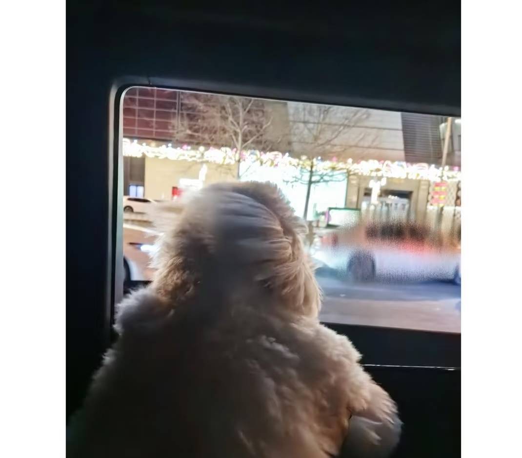 照片里哈哈带了一条红色的围巾,特别的喜庆可爱,很有过年的氛围。还有一张是它站在车里面,好奇的看向窗外的背影。