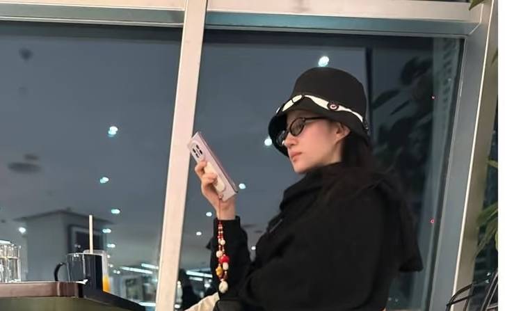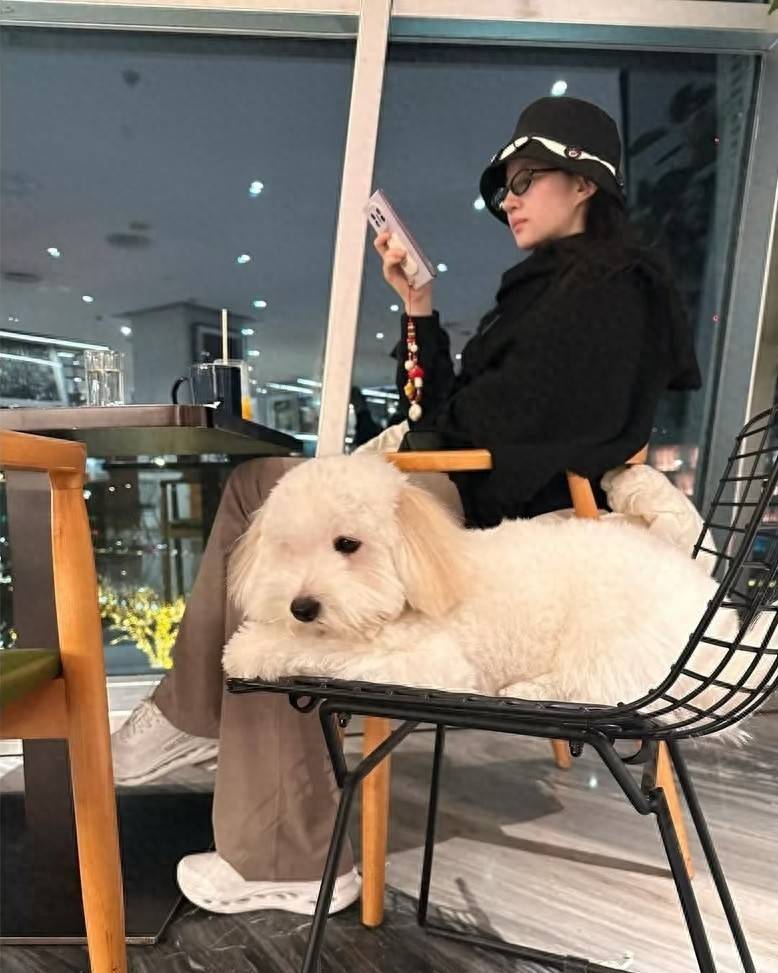 刘亦菲坐在一家店内,正在低头玩着手机,她戴着黑色的帽子和眼镜,穿着黑色的上衣搭配咖色的休闲裤,爱犬哈哈就坐在她旁边的座位上,跟她形影不离。