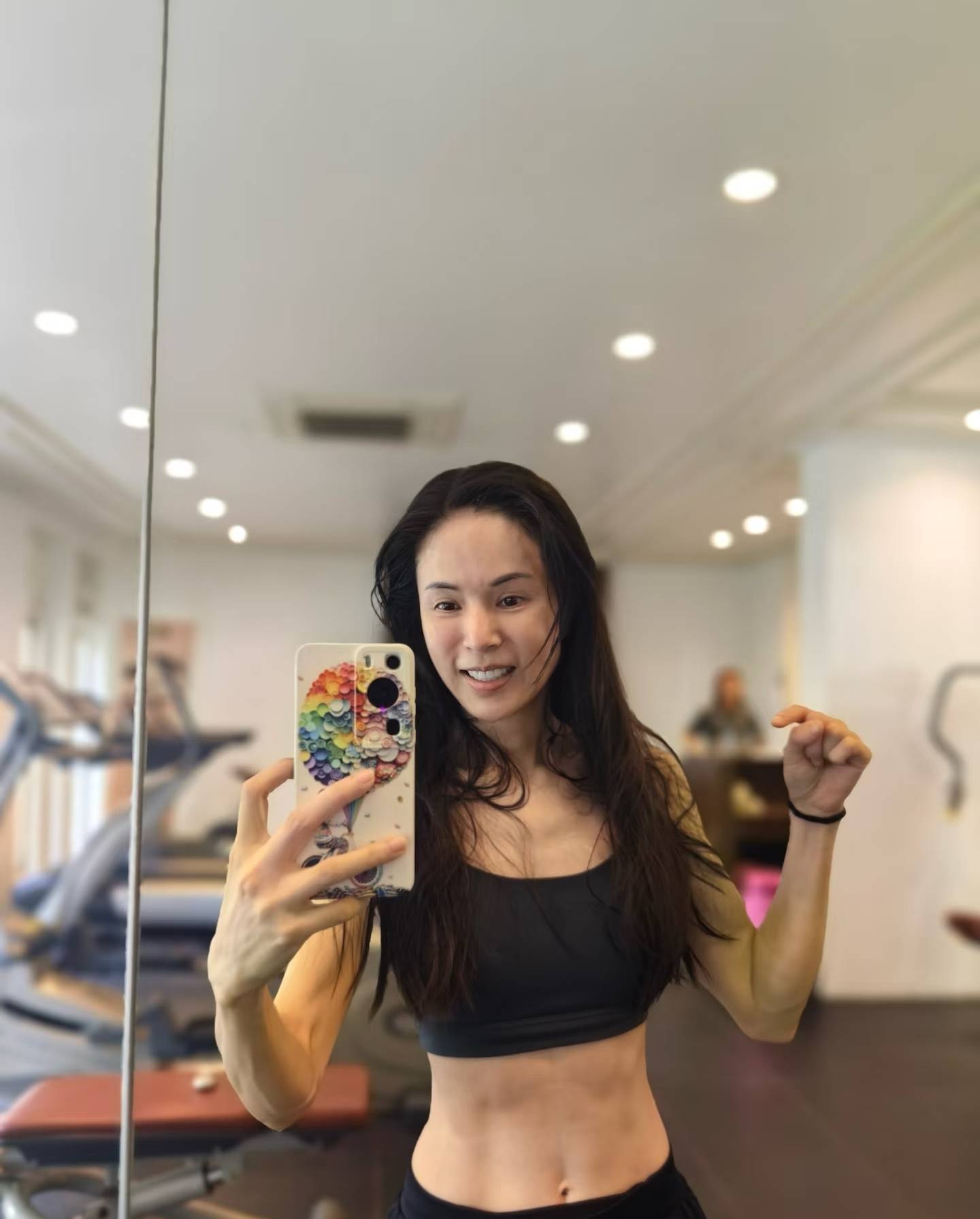 李若彤坚持锻炼确是不争的事实,这在港星当中亦是极为普遍的现象,她们自律得令人惊叹。李若彤健身并非做做样子,看她脸上的汗水以及对镜自拍时的微笑,便知她对自己的坚持亦是颇为满意。