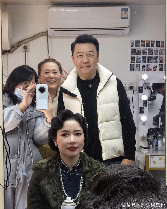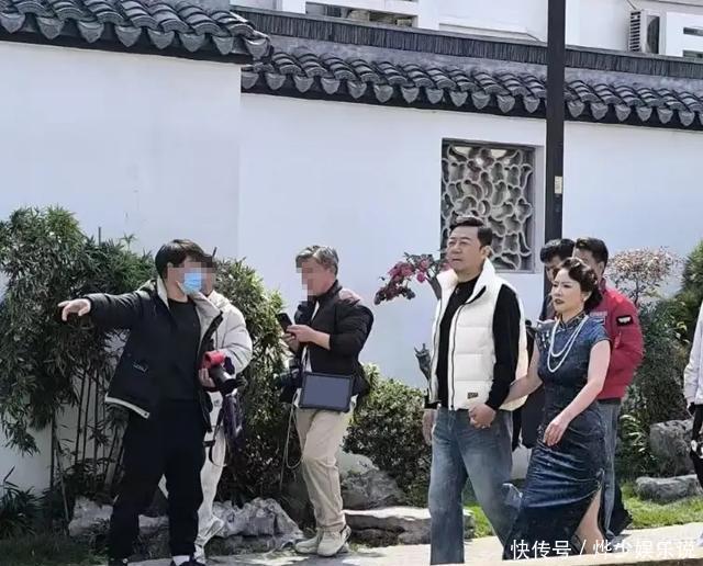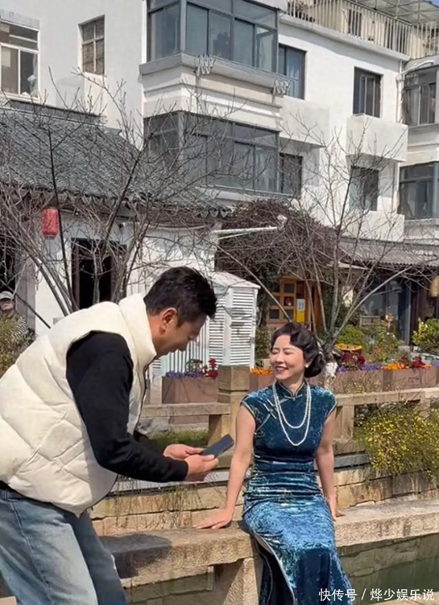 头发、发簪、珍珠耳钉和项链都搭得很精致,整个人看着温润又高雅。郭涛也拍了几张,不过没换衣服,还是黑T恤、白羽绒马甲、牛仔裤,休闲得很,俩人站一起像是两个时代的人,视觉上有点反差。
